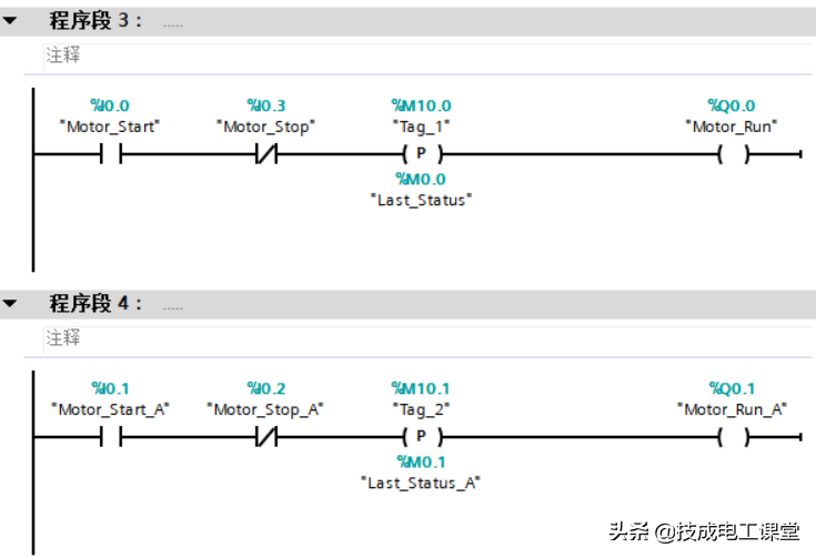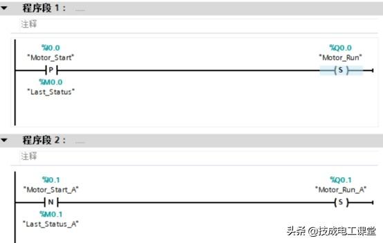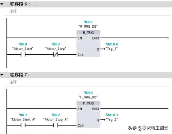 P_TRIG是扫描RLO的信号上升沿指令,N_TRIG是扫描RLO的信号下降沿指令。同样的,这两个指令的下方也是有操作数的,比如下图程序中的M0.0和M0.1都是用来存储上一次的逻辑运算结果的。