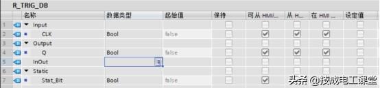 我们看下图的程序,CLK是逻辑运算结果的输入端,R_TRIG指令的上一次逻辑运算结果是存储在背景DB块的“Stat_Bit”这个变量中的。