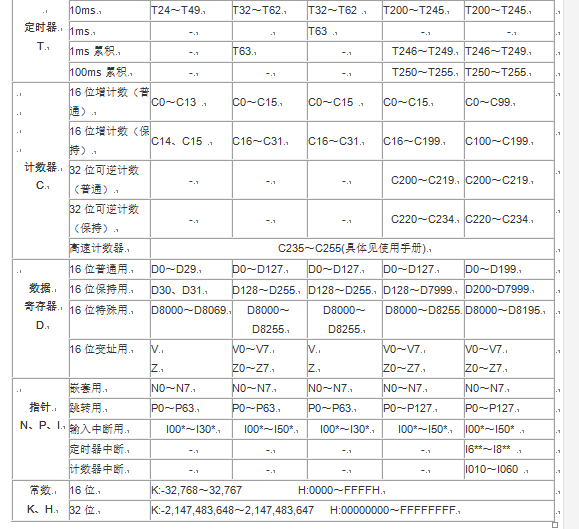 100 ms定时器T0~T199, 共200点,设定值:0.1~ 3276.7秒;