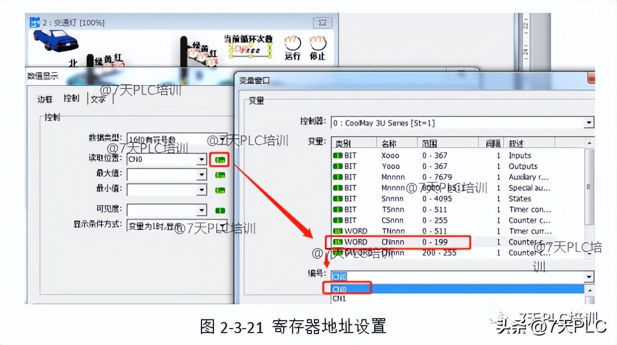 3、那么对于需要显示循环数值的需求,我们通过添加寄存器显示来完成。 点击菜单栏-元件-显示元件-添加数值显示元件,地址设置为CN0,也就是我们程序中的C0。