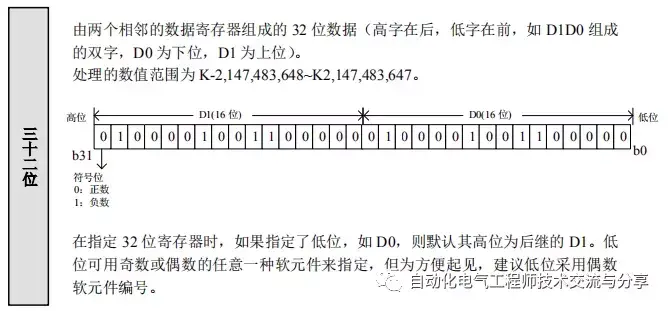 (2),D数据寄存器,一个“数字”大小为一个字(16位),两个“数字”为双字(32位)。如D0为一个字,D0-D1为双字。