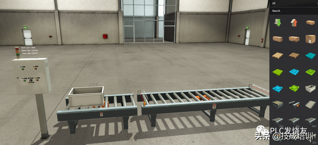 1.我们在模拟软件上搭建了一个简单传送带,并配置了控制面板;
