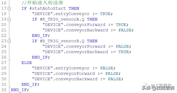 在自动运行模式下,引入传送带直接运行,然后判断货物是否触碰传感器。触碰传感器A,则传送带正方向运行;触碰传感器B,则传送带反方向运行;如果自动运行模式丢失,则停止所有传送带运行:
