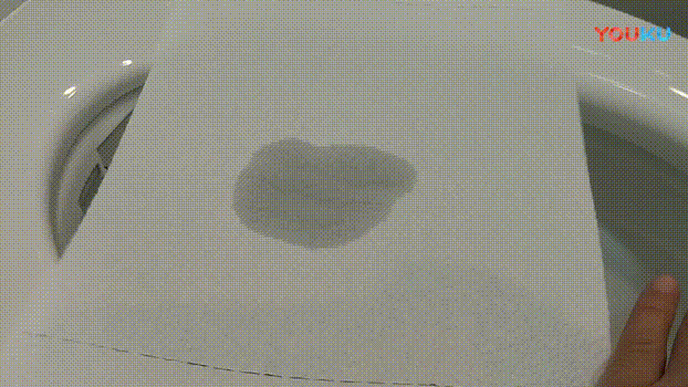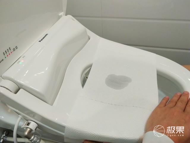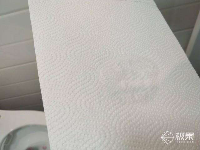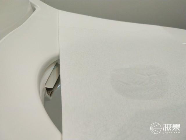 最后一个重要的流程就是烘干,为了演示清楚,我在用卫生纸罩在马桶上,在在中间位置滴了一滩清水,看看烘干的效果如何。
