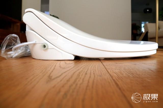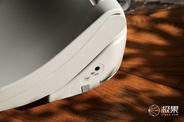 从侧面看,一侧是进水口和电源线,马桶圈整体呈流线型,虽然看起来非常薄,但是坐上去之后却非常稳定,感觉很扎实。不用担心有安全问题。