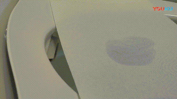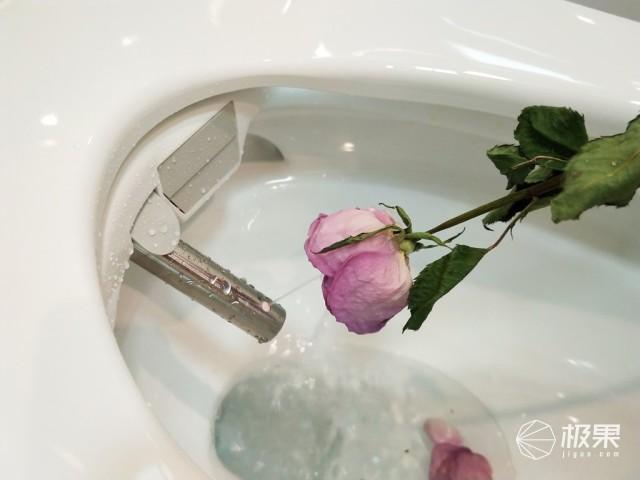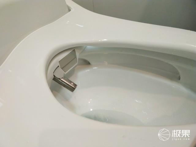 在冲洗时,马桶圈底部伸出一只喷嘴,温水几乎是瞬间就喷出,没有任何等待时间,这大概归功于日本进口陶瓷加热片的使用,极短时间内就可以将冷水加热,不会有忽冷忽热的感受。