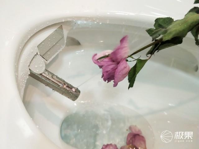 用干花来直观感受一下水流的力度,可以看到水流冲洗的力度还是蛮强大的。这样的冲洗就不用担心身体上会留下什么脏东西了,即使皮肤褶皱中的污垢也可以很轻松的被冲掉。