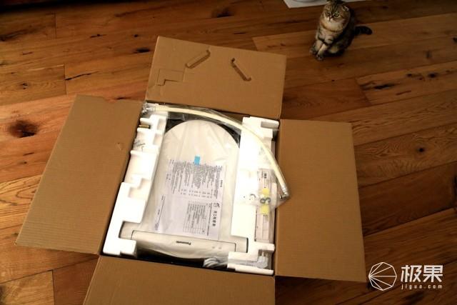 索性先让我们了解一下这款马桶盖的外观和部件。里面的部件其实很简单,除了马桶盖自身,还有就是进水管和安装的一些小附件,看起来并不复杂。