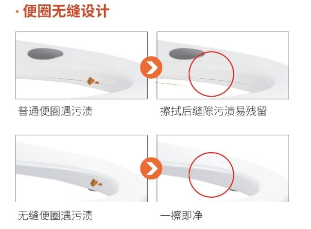 另外一个最大的好处就是,当有脏东西粘在马桶圈上时,这种无缝设计的便圈就可以很容易清理掉,不会留在缝隙中,平时也几乎不会有灰尘或污垢可以藏在下面,从官网找了张图就一目了然了。